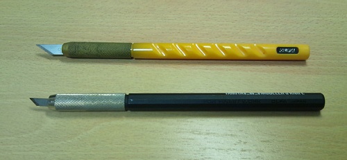 上の黄色いデザインナイフが中学校の頃から使っているモノ。