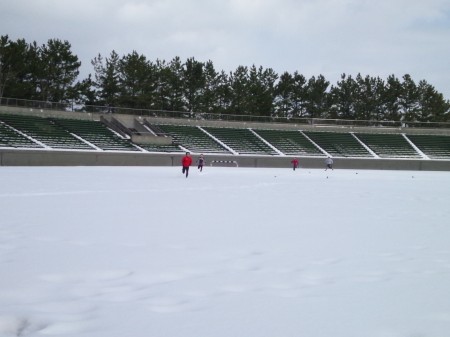スパイクをはいて積雪15cmほどのトラック、300mのスタート地点へ。
