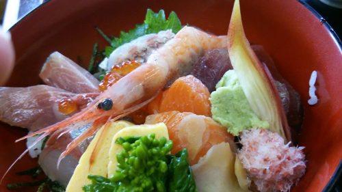 氷見温泉郷 総湯からの漁港内の食堂。温泉はしょっぱかったけど、海鮮丼はうまうま♪天気が悪いのが残念だけど、北陸だしね。