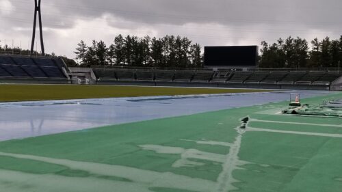 動きづくりから流しの最中に、後からやってきた中学校が雨天走路の全レーンにスタブロを置いてスタート練習をし始めた。