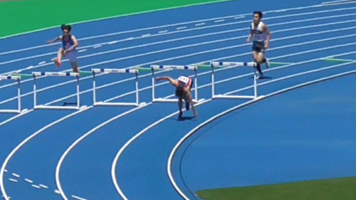 それでも8台目に届かず無理やりの19歩になったところでリード脚がハードルに乗っかるカタチで終了。