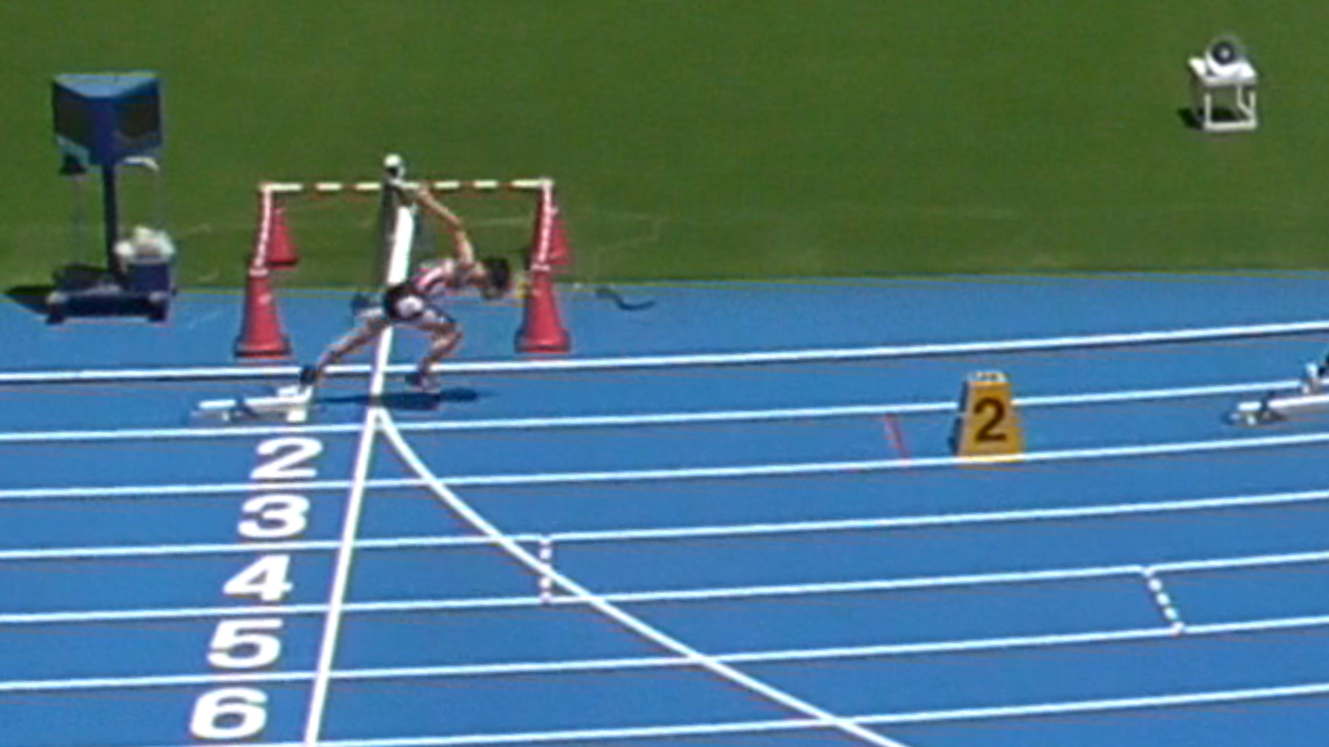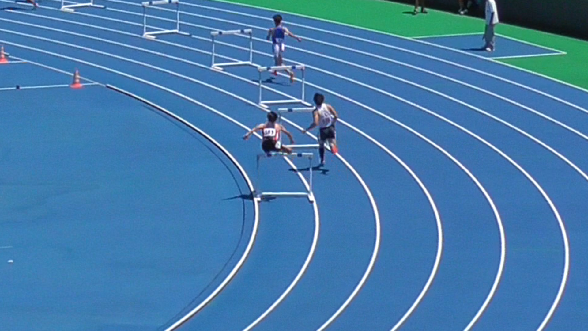 逆脚スタートの飛び出しは成功。トラックが熱すぎて指を付いての静止が正直苦痛だったが、練習直後に一人だけ水をまいたことが功を奏した。地味にスタンディングで飛び出し練習をしてきたかいがあったかな。