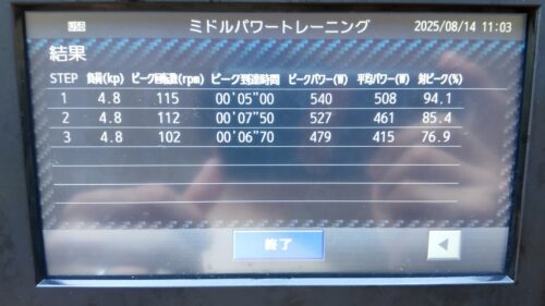 jogなのか、陽射しなのか、スタートから明らかに脚が重かったから予想はできていたが、3本目に踏ん張れなかったのは情けない。気持ちでは負けずに出し切れたので、次はこれ以上の数値をだせるようにがんばる。