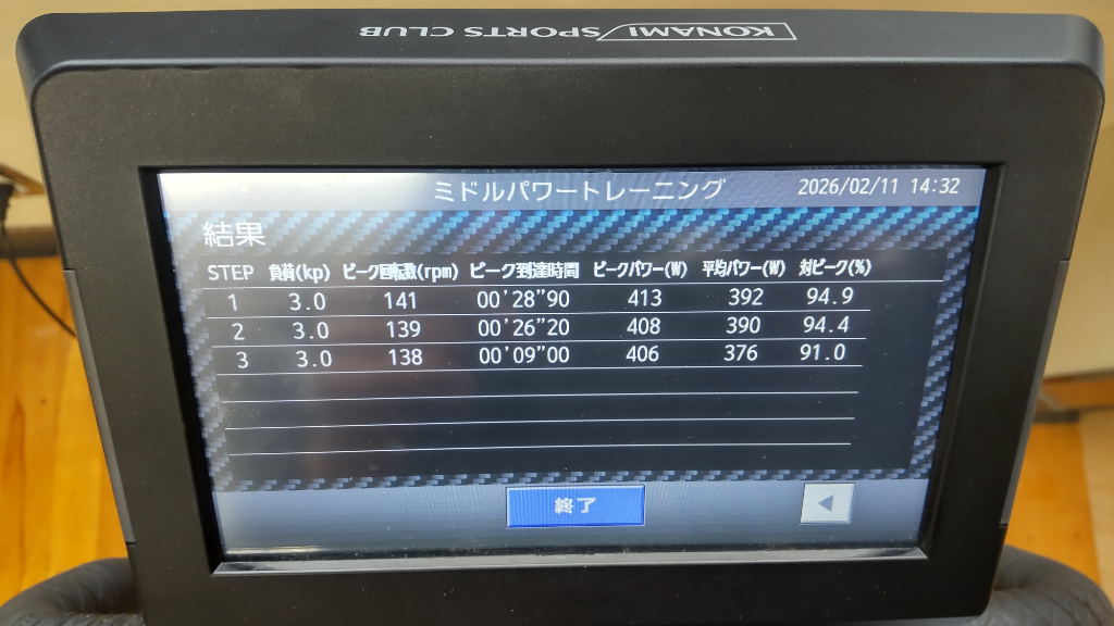 回:最大rpm:平均W:対ピーク%:レスト