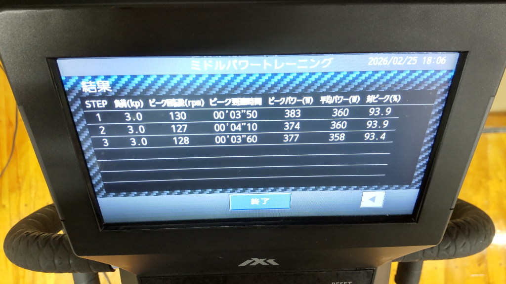 喉の様子を見ながら呼吸を荒げないトレーニングの予定だったが、3.0kpでも120rpmキープが予想よりも良い感じで回すことができた。2セット目も2分レストでまったく問題なし。3セット目にそのまま突入しようかとも頭をよぎったが、ココまでできるのならと休憩を10分取って3.0kpの125rpmキープにして負荷を上げてみた。
