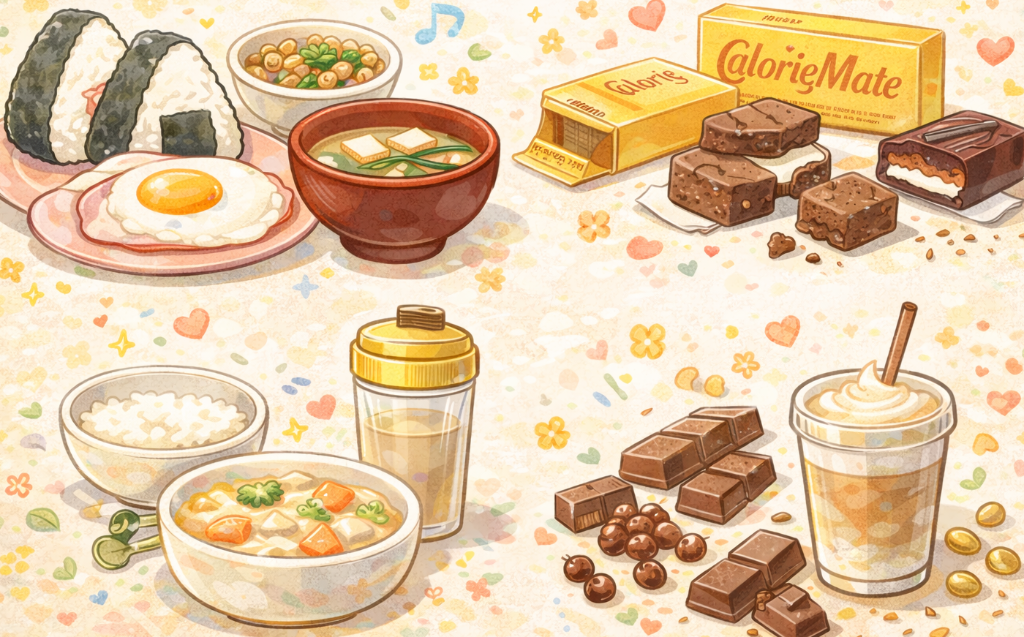 朝:おにぎり、ハムエッグ、納豆、味噌汁